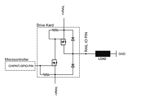 The (source) Drive Kard has 4 FET drivers to allow control of the four rail pins for the slot into which it is inserted. Each output can safely drive 750mA of current (maximum of 6A per RAIL). The Vds max for each pin > 24VDC.